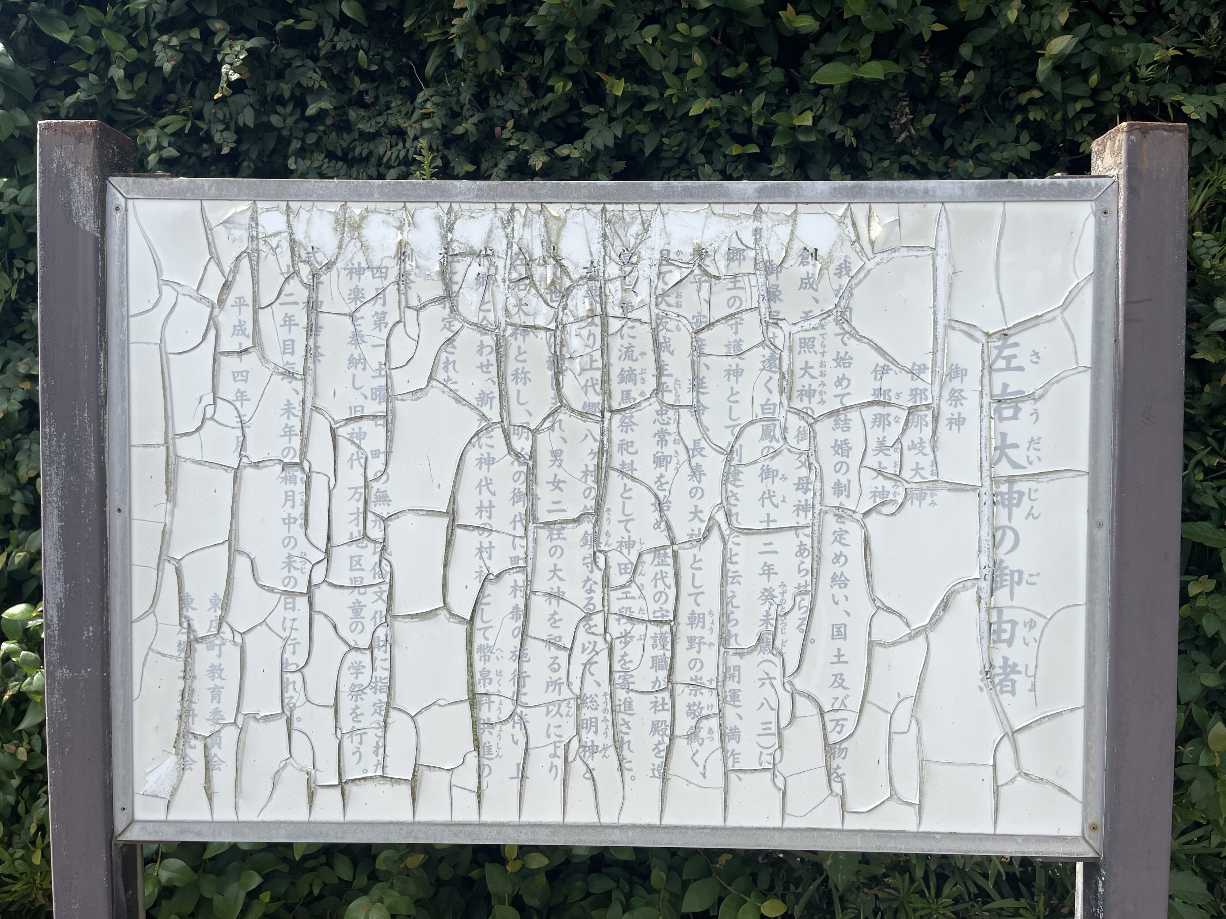 御縁起は遠く白鳳の御代十二年癸未歳(六八三)に、郷土の守護神として創建されたと伝えられ、海運、満作、授子、安産、延命、長寿の大神として朝野の崇敬篤く、且て大友城主平忠常卿を始め、歴代の守護職が社殿を造営し、更に流鏑馬祭祀料として神田三段歩を寄進された。古来より上代郷八カ村の総鎮守なるを以て、総明神として世人に親しまれ、男女二柱の大神を祀る所以により左右大神と称し、明治の御代に町村制の施行に伴い、上代郷と合わせ、新たに神代村の村社として幣帛料供進の社に指定された。