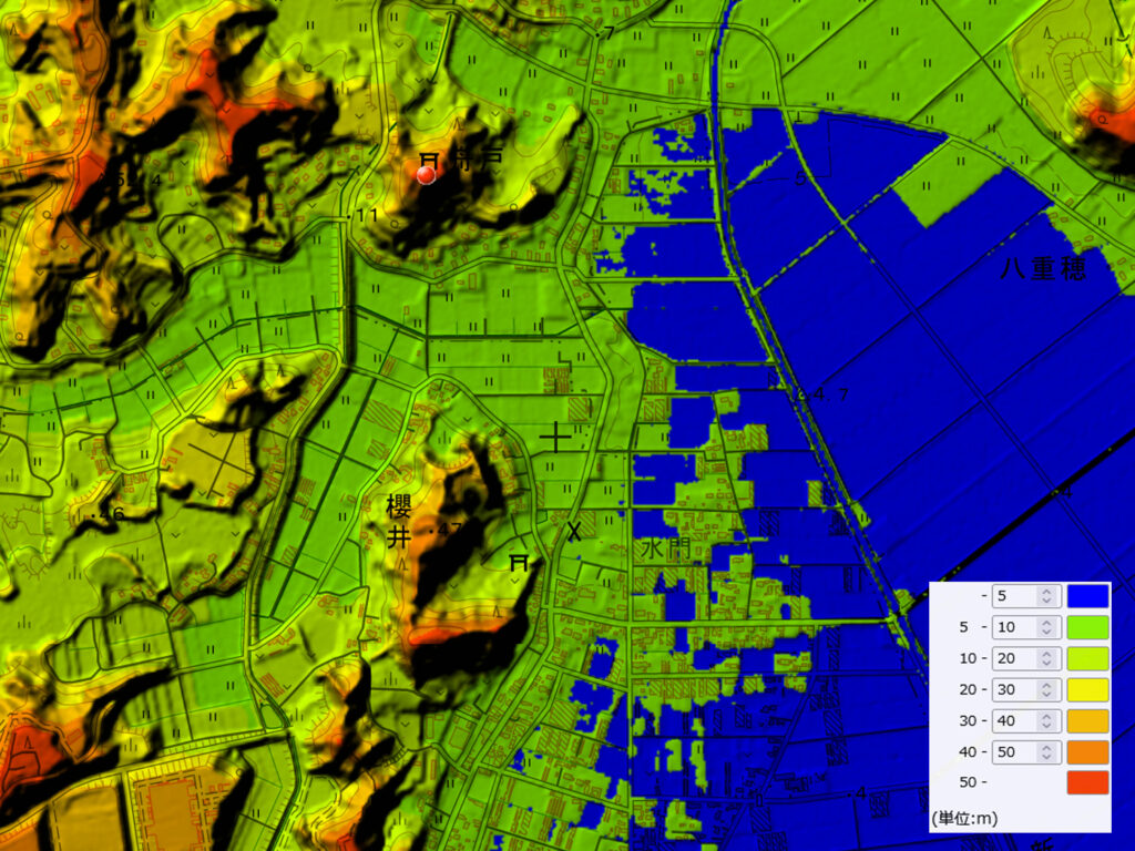 中央上部の独立丘陵の上に、「左右神社」が鎮座している(赤ポイント)
