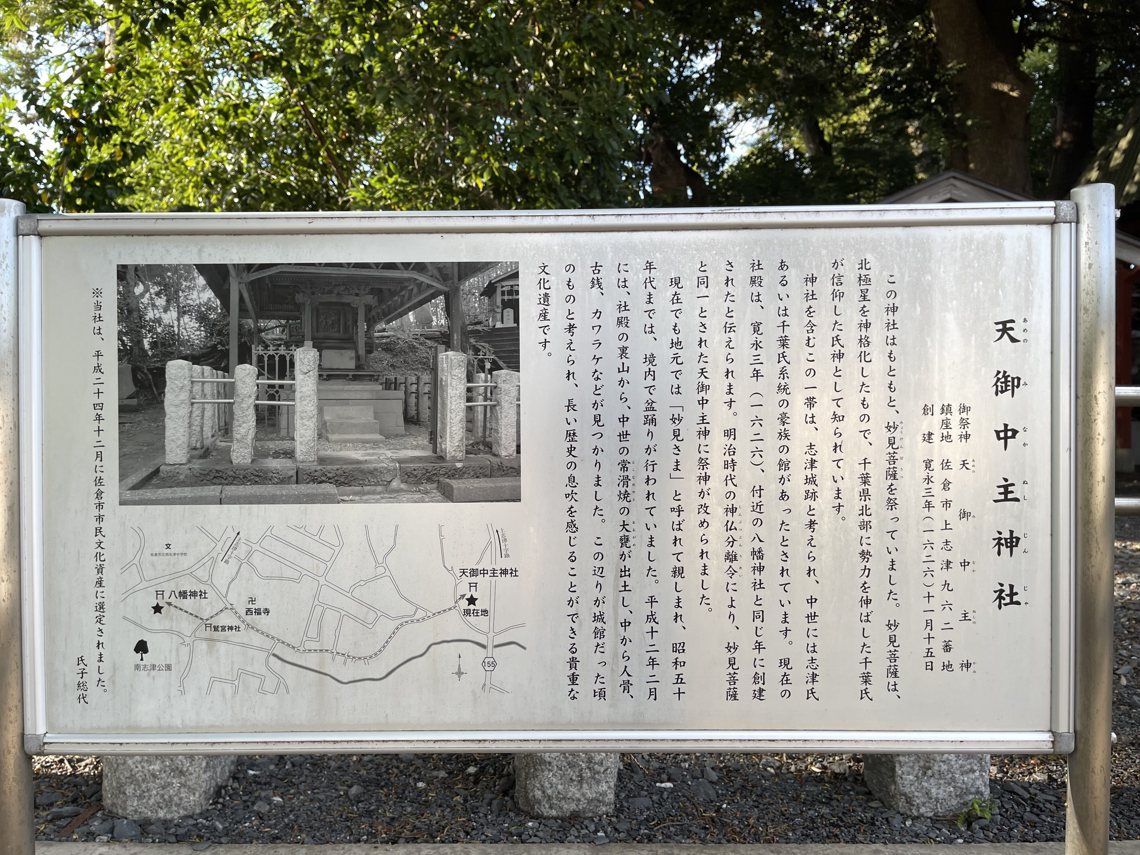神社を含むこの一帯は、志津城跡と考えられ、中世には志津氏あるいは千葉氏系統の豪族の館があったとされています。現在の社殿は、寛永三年(一六二六)、付近の八幡神社と同じ年に創建されたと伝えられます。明治時代の神仏分離令により、妙見菩薩と同一とされた天御中主神に祭神が改められました。