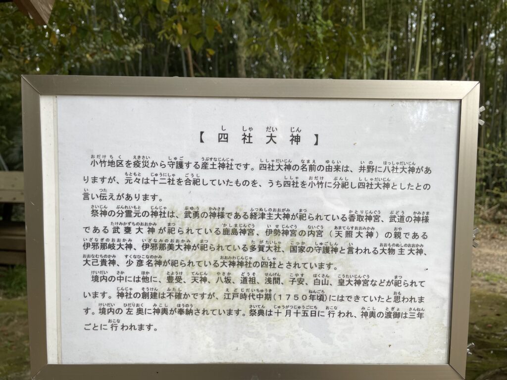 小竹地区を疫災から守護する産土神社です。四社大神の名前の由来は、井野に八社大神がありますが、元々は十二社を合祀していたものを、うち四社を小竹に分祀し四社大神としたとの言い伝えがあります。