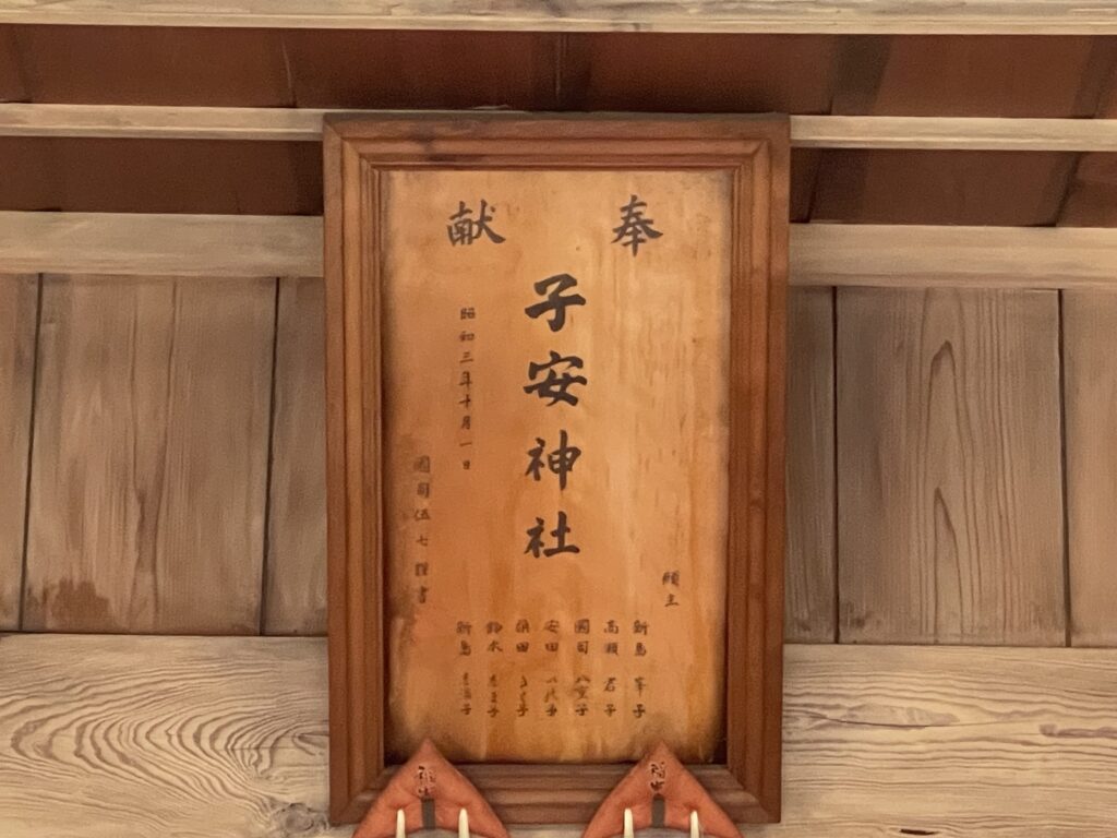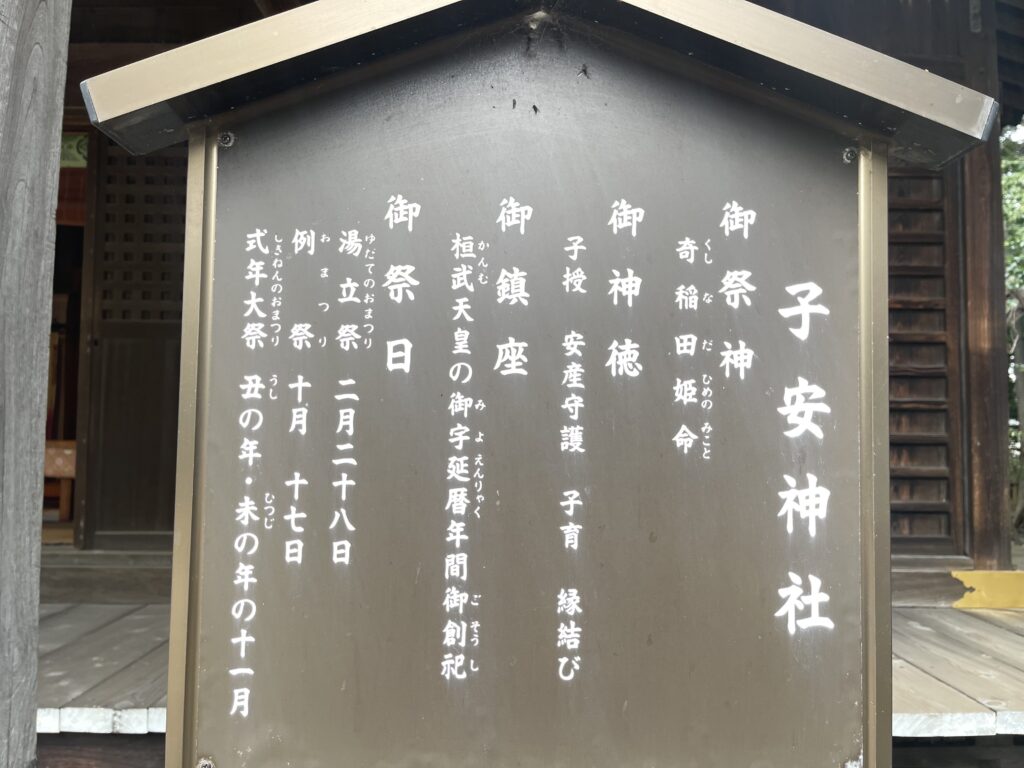 その後、第六十代 醍醐天皇の延喜年間(901年から923年)、茨城県稲敷郡(現 笠間市稲田)の「稲田神社」より「奇稲田姫命」を勧請し「子安大明神」となりました。