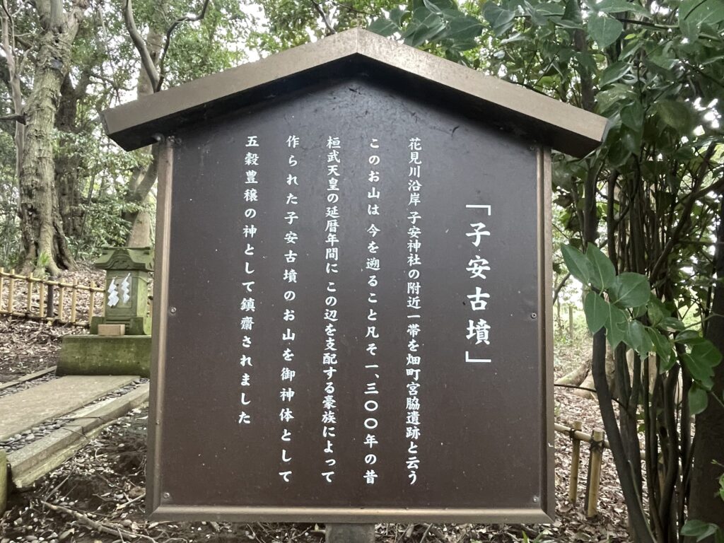 当社周辺には、当地を治めていた豪族の円墳三基からなる「子安古墳」(子安古墳群)があります。当社は、第五十代 桓武天皇の延暦年間(782年から806年)に、この古墳を御神体とし五穀豊穣の神として創始されました。