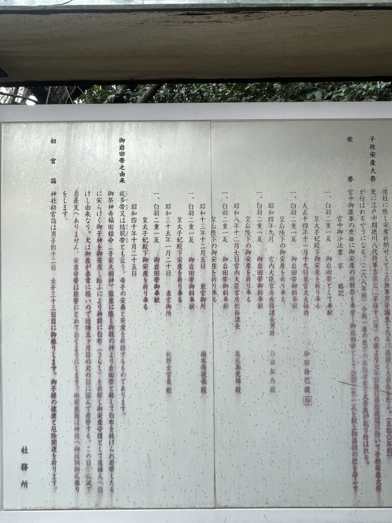 当社は、皇室の懐妊時に安産祈願を行い、御岩田帯(いわたおび。妊婦が安産を願って巻く腹帯)として白羽二重一反を献上して受納される名誉を得ています。