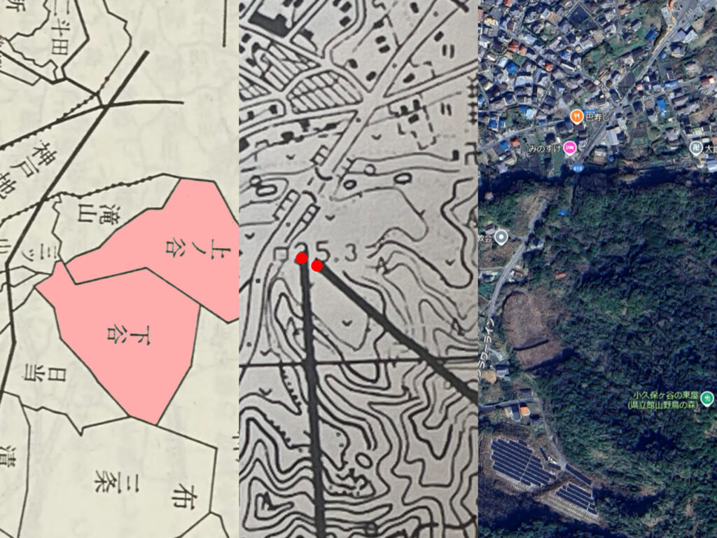 森谷氏の論文の地図を見ると、「上ノ谷」「下谷」は、房総フラワーライン「布良」バス停周辺、東西方向に延びる丘陵の西端にあったように思われます。現在は、旧跡や石碑もなく判然としません。