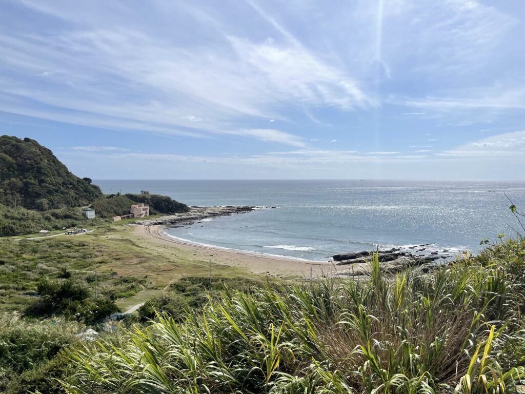 画面中央少し左に海蝕の跡であろうか、地層が見える。