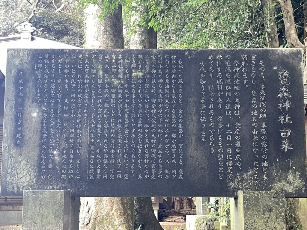 境内由緒書に、「祭神武波槌の大神は、食産の道を広め」「御祭神武波槌の大神の御代に」と記載されています。