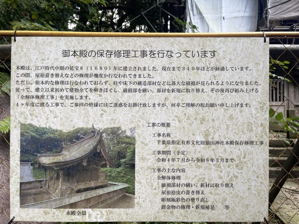 江戸時代中期の1680年建立の本殿は、令和8年3月まで改修中とのことです。楽しみですね。