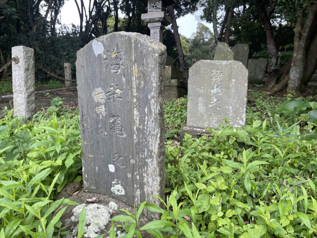 万一、カメが釣針にかかり死んだ場合は、自分の先祖よりもはずんだ墓を作ります。この墓は「亀の子さま」と呼ばれ、現在も、「川口神社」境内や、浜辺で何基も見ることができます。