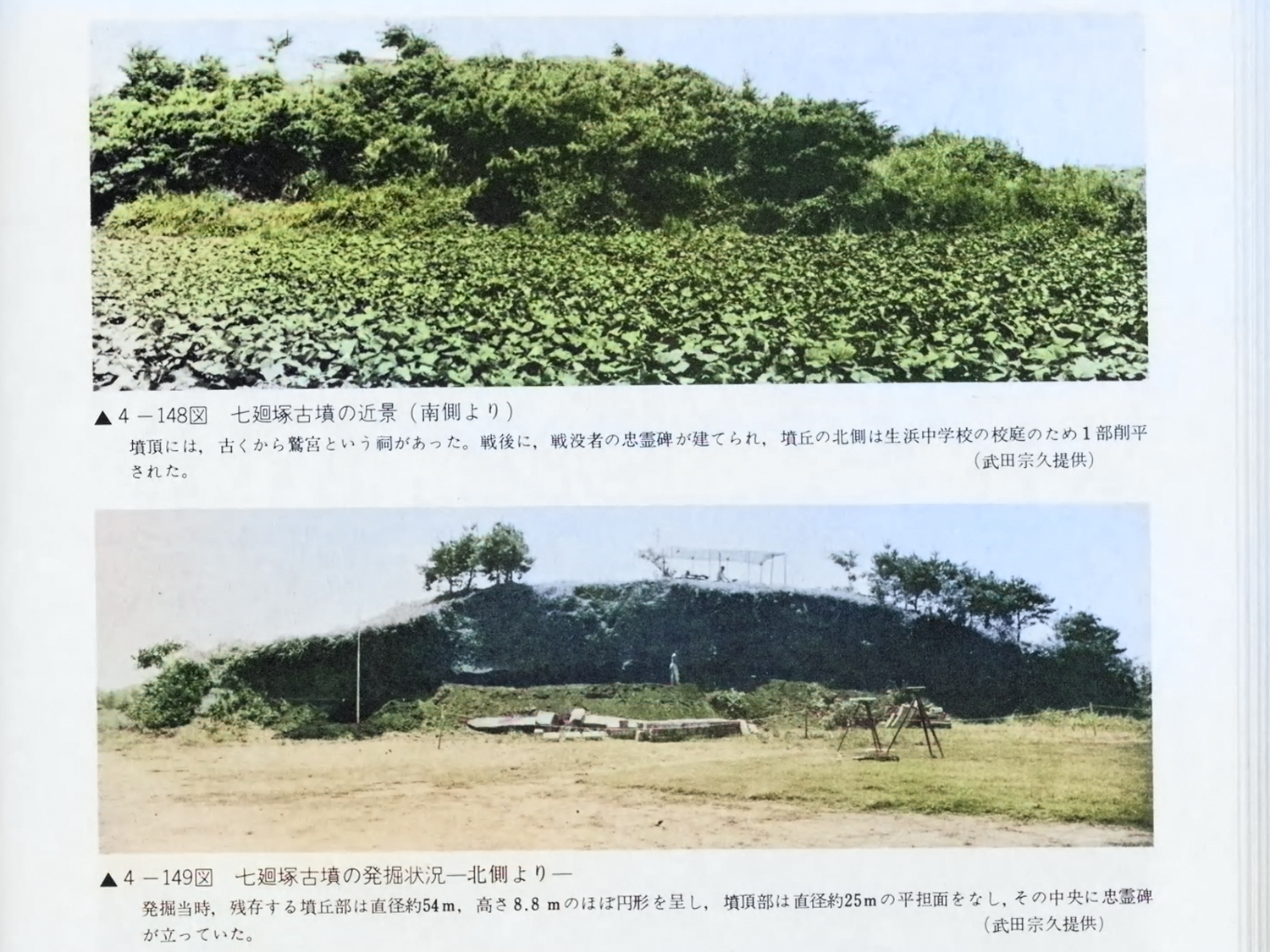 「七廻塚古墳」は、生浜東小学校(当時の生浜中学校)の校庭にかつて存在した、市内最大の古墳です。