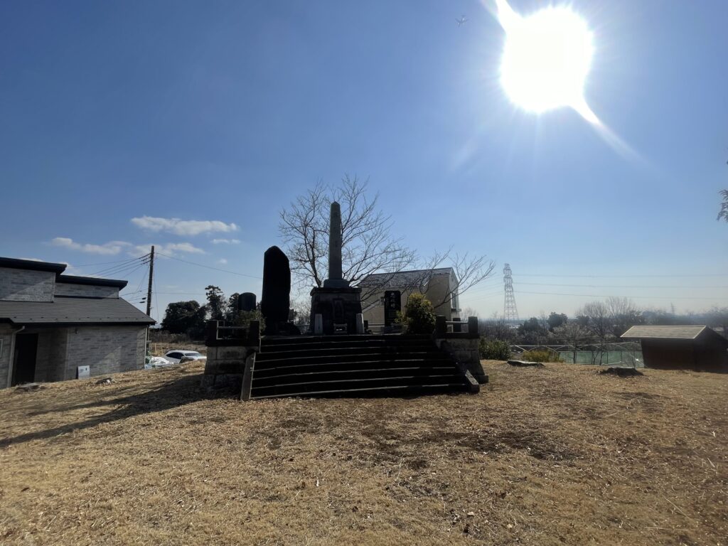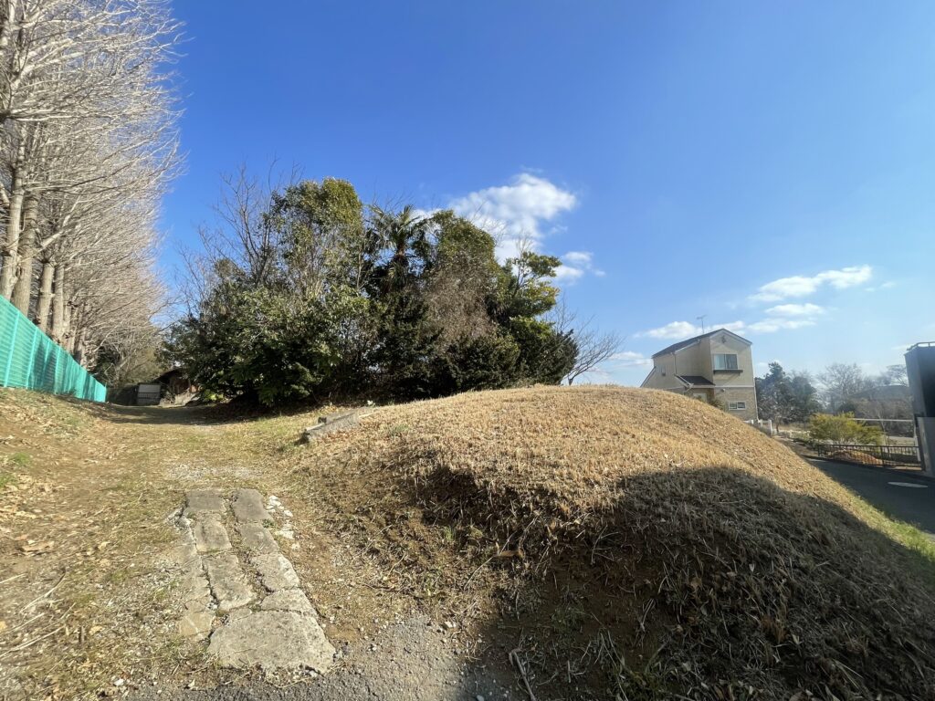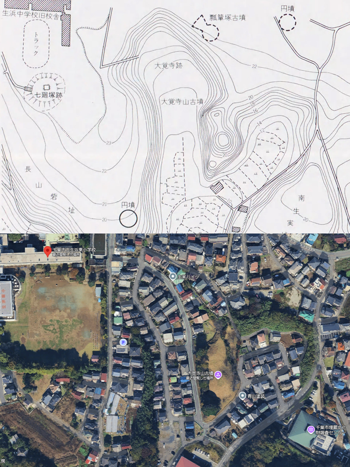 当墳は校庭拡張工事に伴い消滅。現在、学校の南には忠魂碑が建っており、生実川・浜野川流域の低地を見下ろすことができます。往古、古墳の南には一面の麻畑と水田が広がっていたのでしょうか。