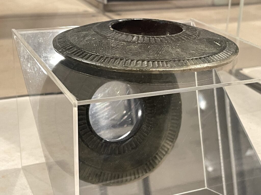 石釧(いしくしろ)は、石製の腕輪型装身具のこと。本墳から出土した石釧は、滑石製、直系16.5cmの良品で、1992年の資料に「わが国で最も大きなもの」とあります(『千葉県の不思議事典』)。千葉市埋蔵文化財調査センターに展示されており、表側だけでなく、裏側の見事な彫刻も見ることができます。