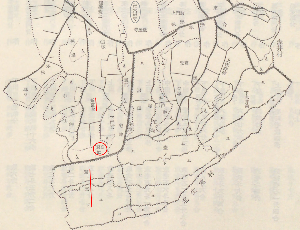 当社の周辺には、「鷲宮台」「鷲宮下」などの地名が残ります。