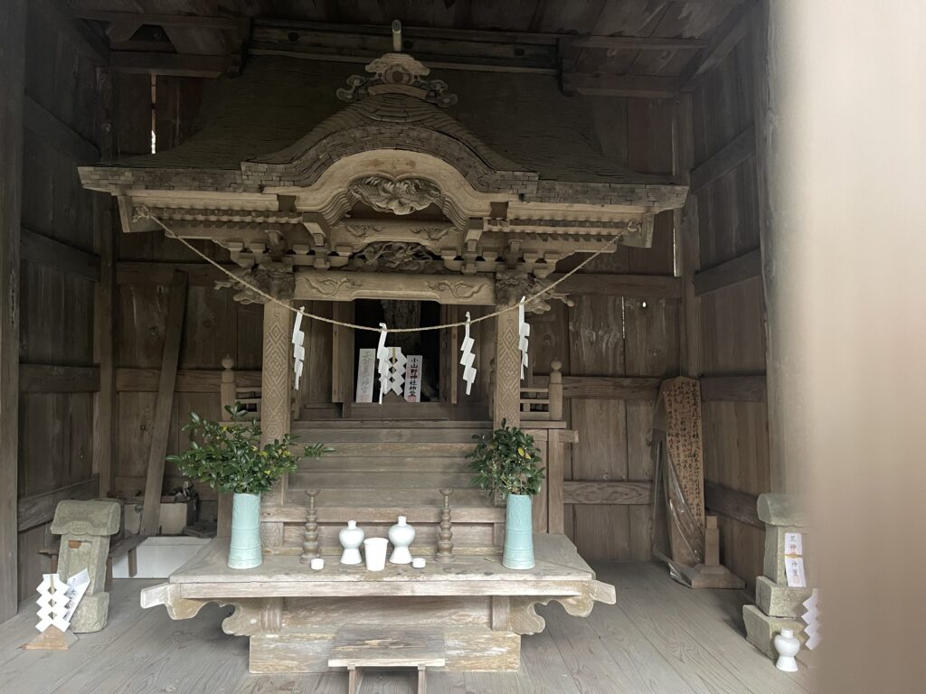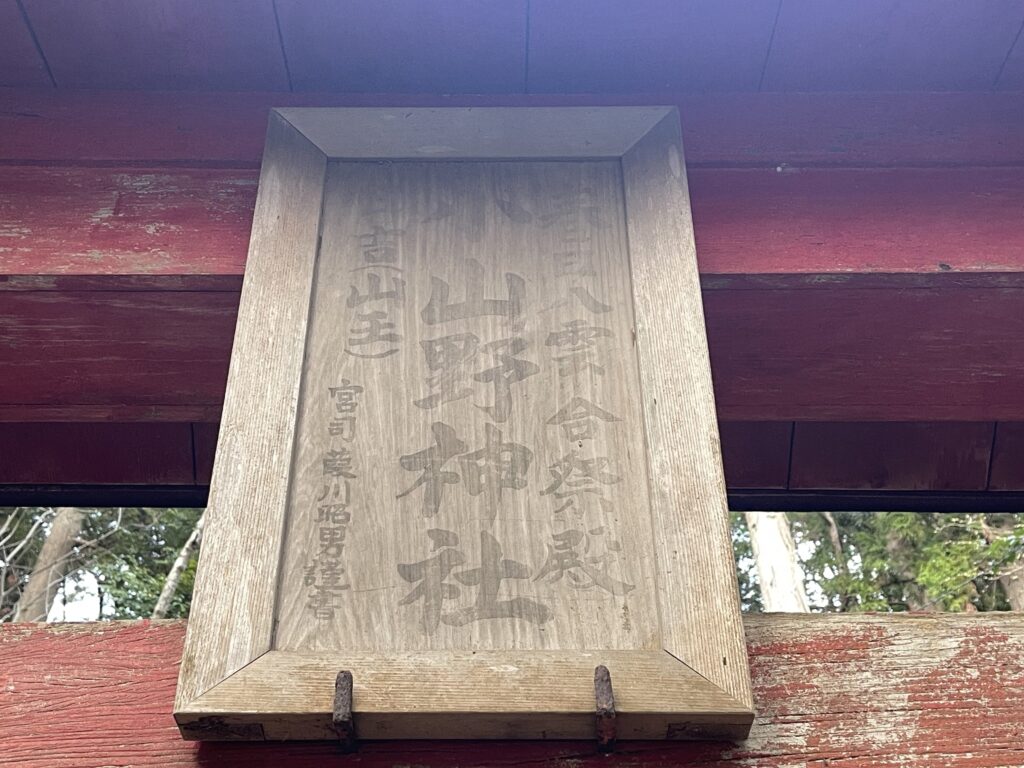- 「春日神社」…小山野三八四。山野集落の鎮守とされる。享和三年(1803年)に「劔持識右エ門」により明神山に建立された。