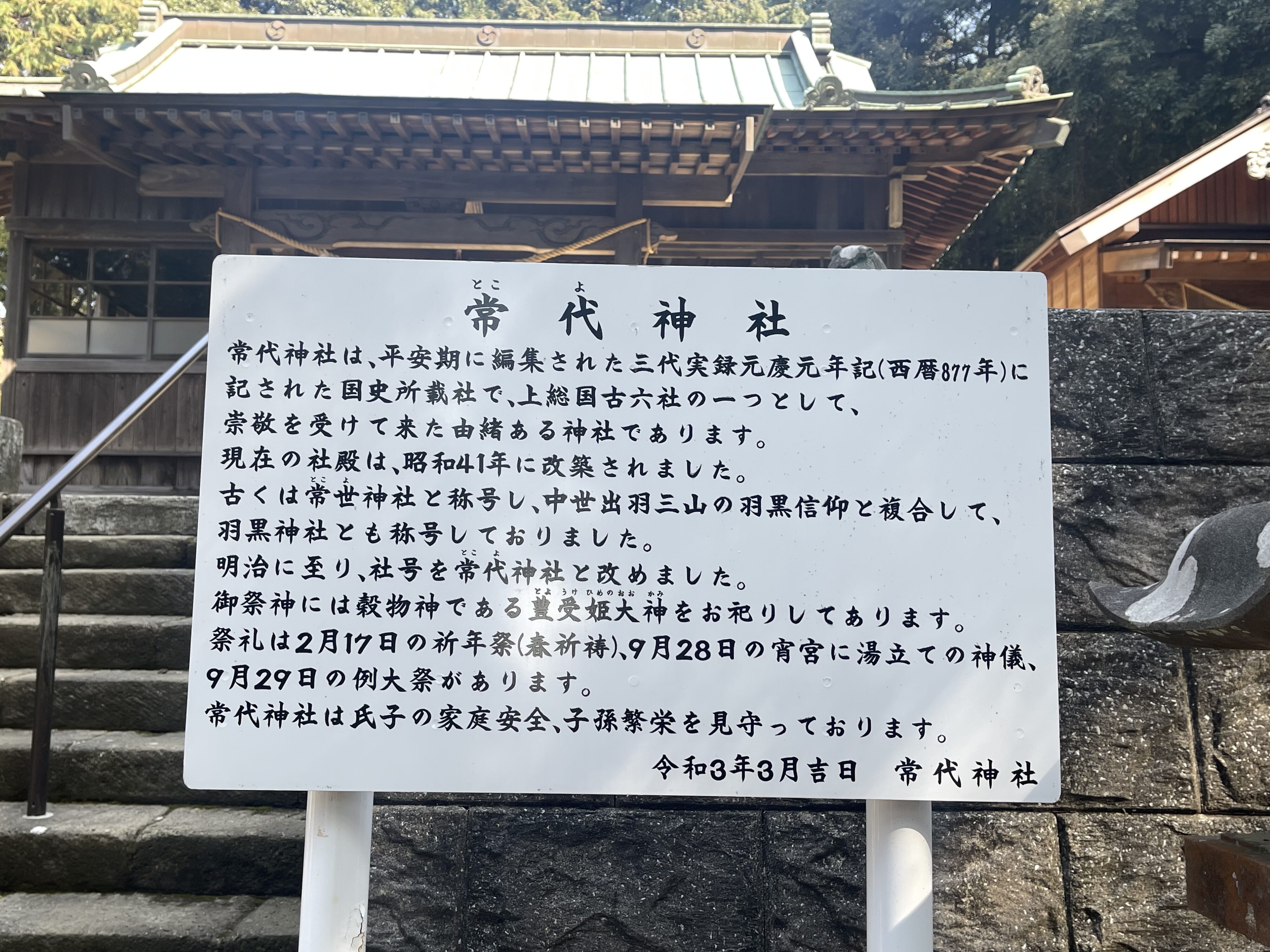 上総国周淮郡庁はこの社西方約一・三キロ程の所にあり、郡司の申達により元慶元年従五位下(この時既に正六位上)を授けられた国史所載社である。上総古六社の一つで、わが国古代の他界観「常世」の神を祀ったものと思考される。中世羽黒信仰と習合し羽黒大権現と称した事もある。昭和四一年本殿修理及び幣殿・拝殿を改築、内陣は天明四年一一月の再建と伝える。神社周辺に古墳群が点在し常代草創の祖宗の墳墓と伝えられている。所載の国史は『三代実録』元慶元年記。