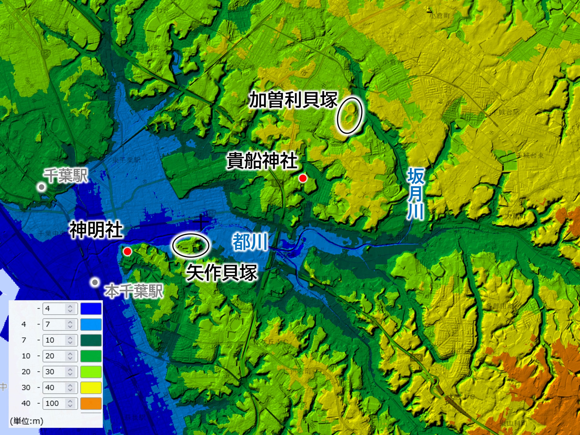 現在よりも4mほど海水面の高かったとされる、縄文海進時(縄文時代前期・約6,500年~約6,000年前)の都川下流域の地形を見ると、当社は、台地の端、半島地形の先端に位置していることがわかります。