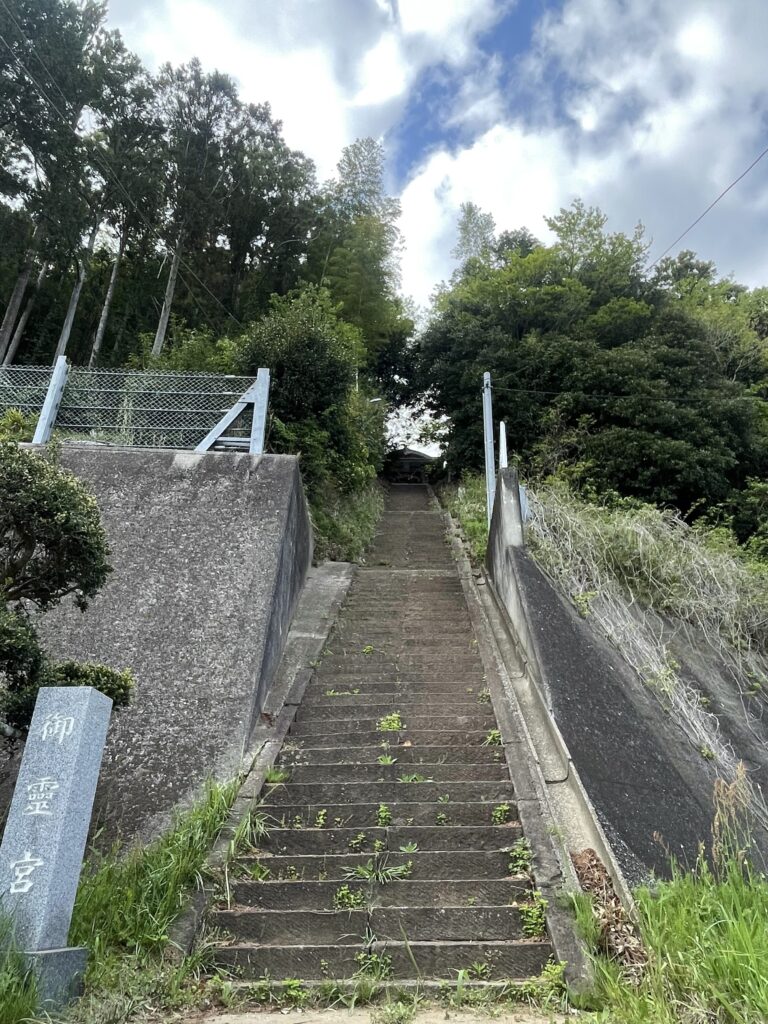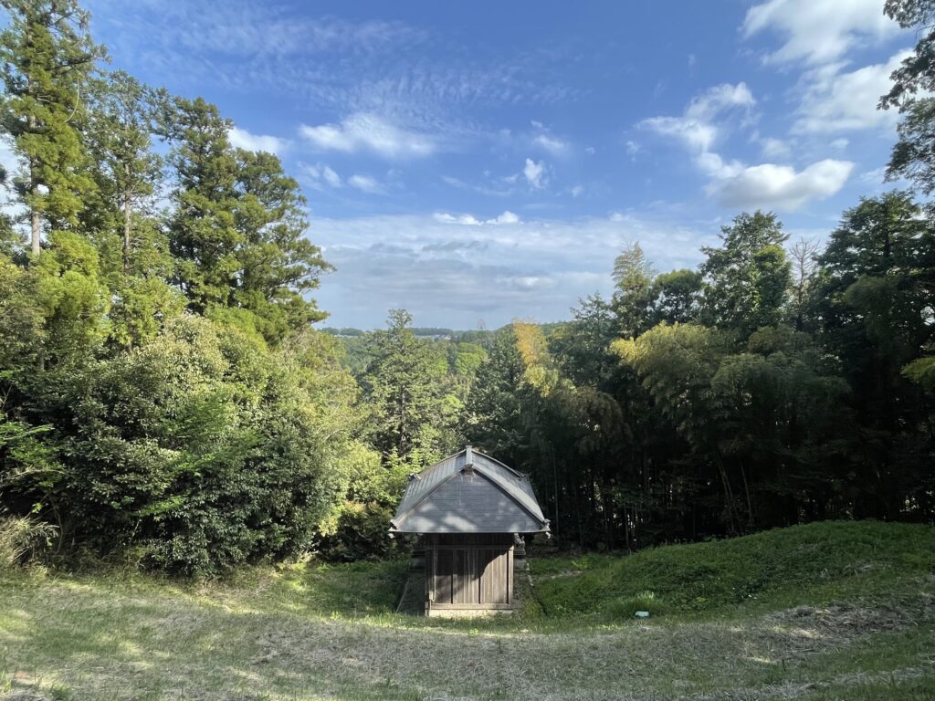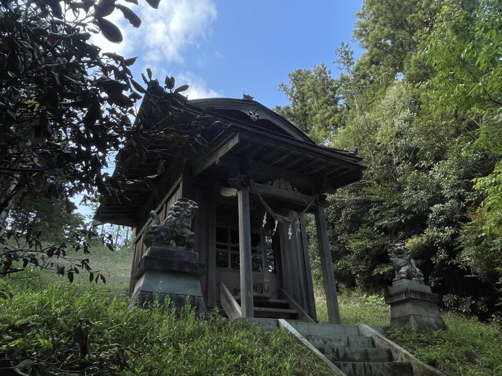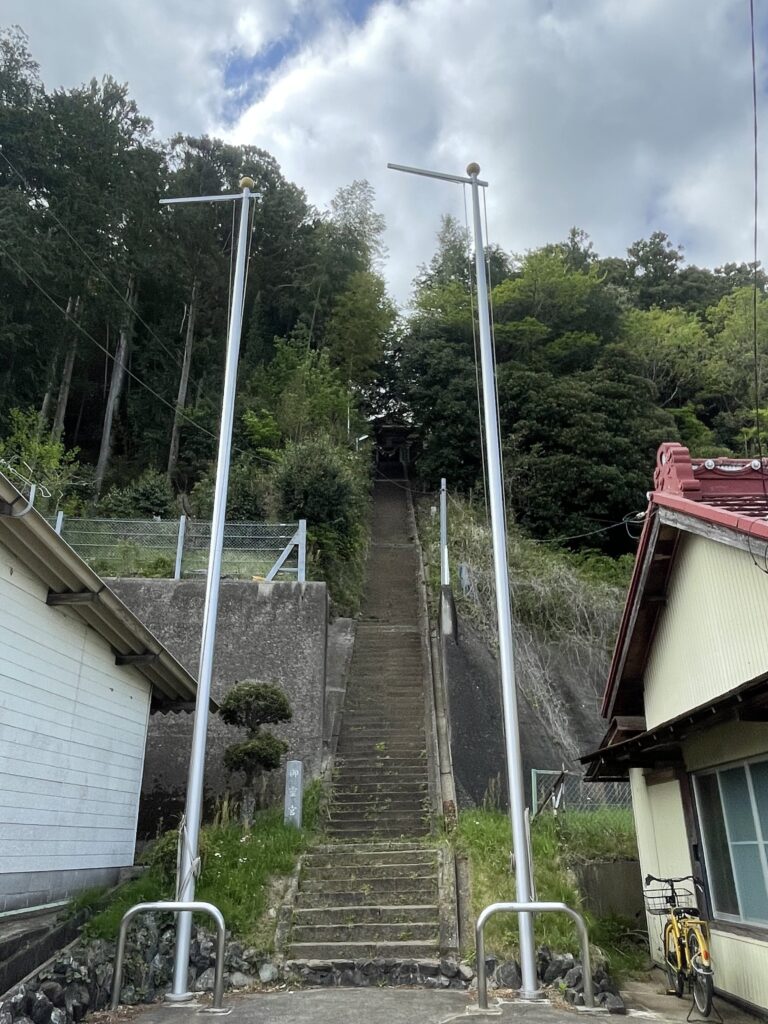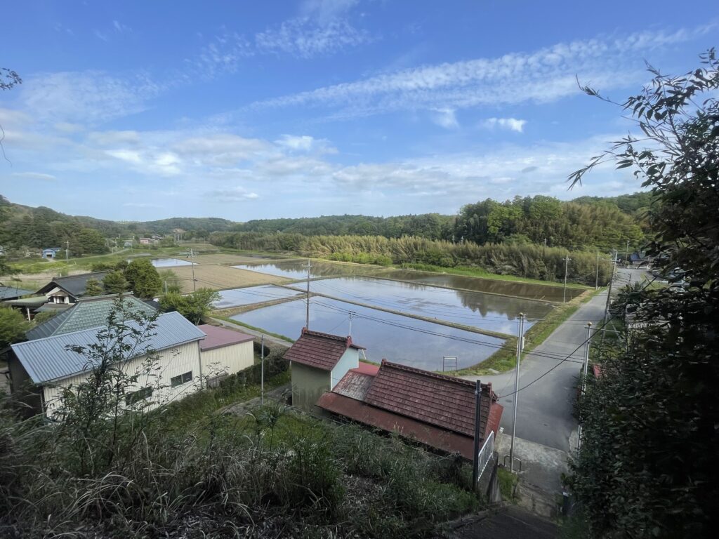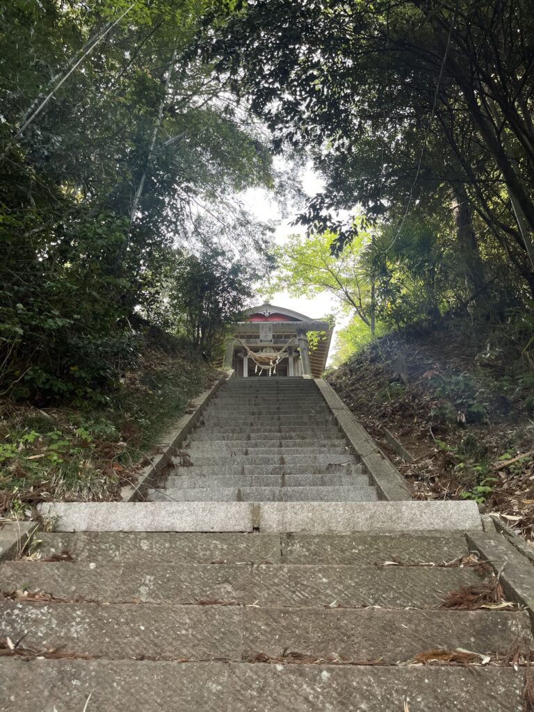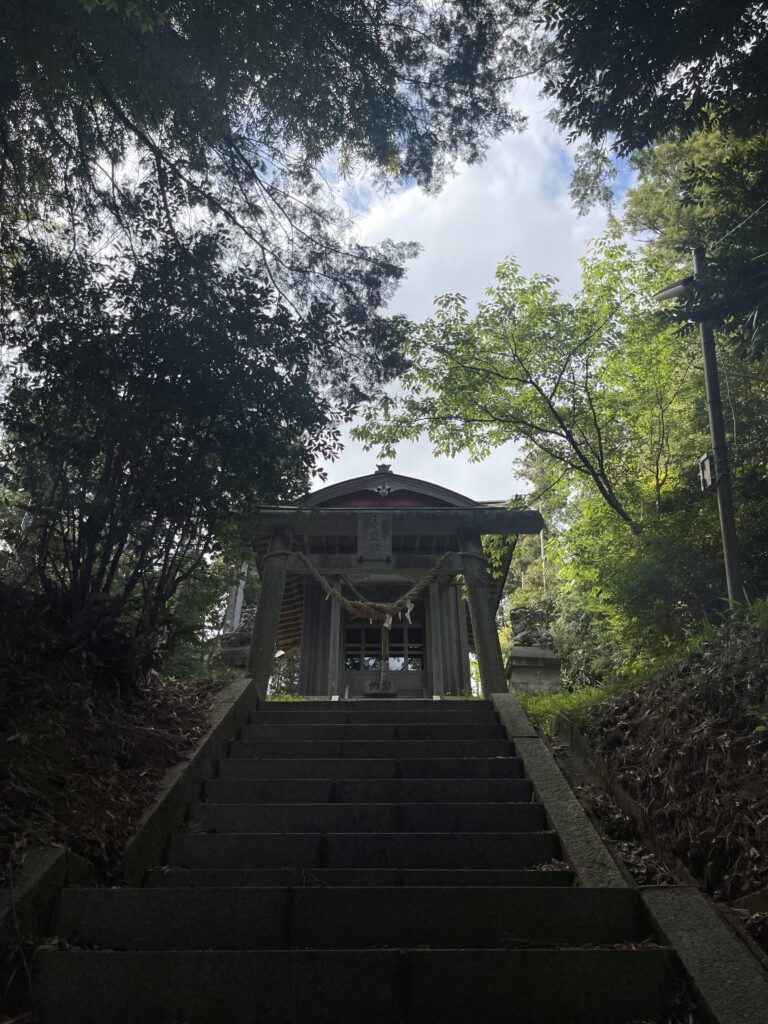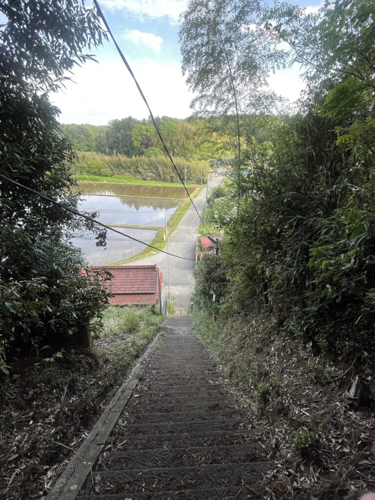当社境内は、急な階段を数十段登った台地の上にあります。階段を振り返った眼下の水田風景や、社殿背後から見える東京ドイツ村の観覧車など、景色がとても素晴らしいです。